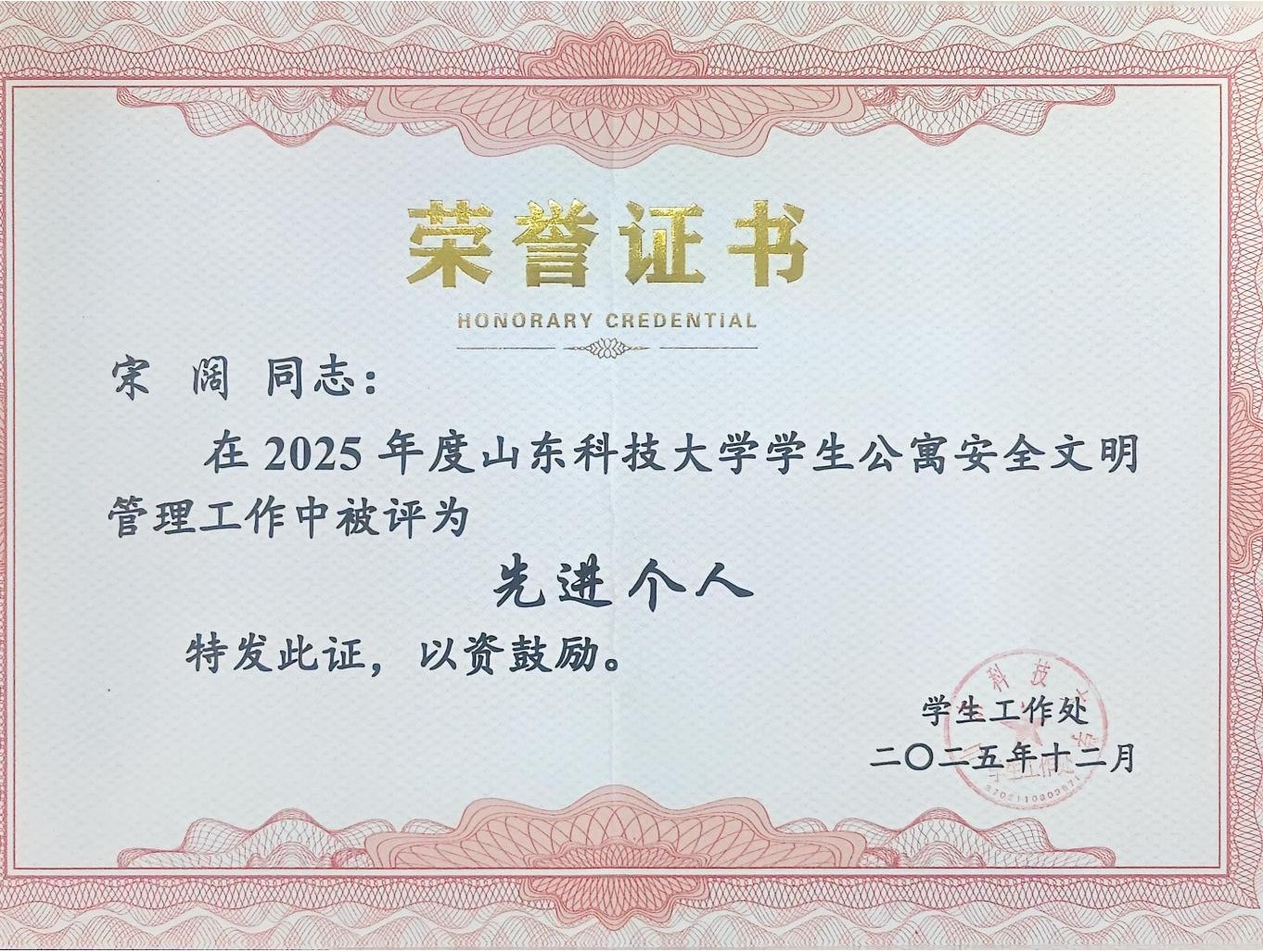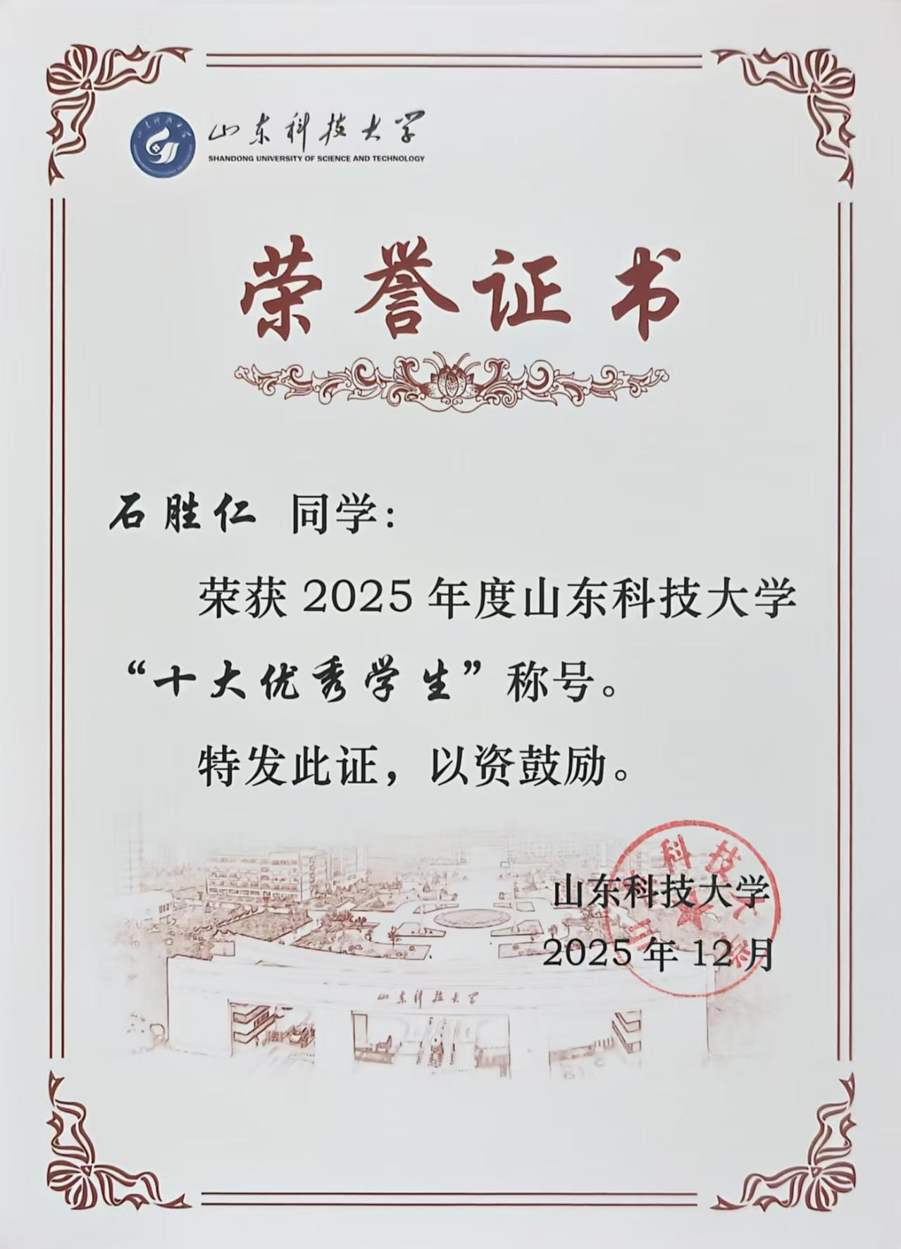石胜仁同学获评亚洲色图-成人色图-亚洲成人 “十大优秀学生”荣誉称号